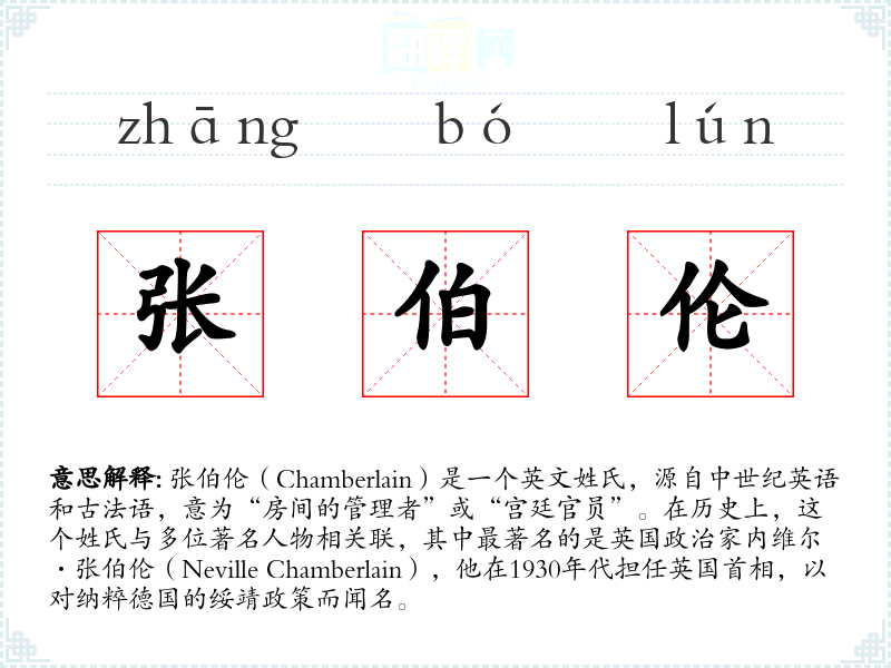 张伯伦(Chamberlain)是一个英文姓氏,源自中世纪英语和古法语,意为“房间的管理者”或“宫廷官员”。在历史上,这个姓氏与多位著名人物相关联,其中最著名的是英国政治家内维尔·张伯伦(Neville Chamberlain),他在1930年代担任英国首相,以对纳粹德国的绥靖政策而闻名。