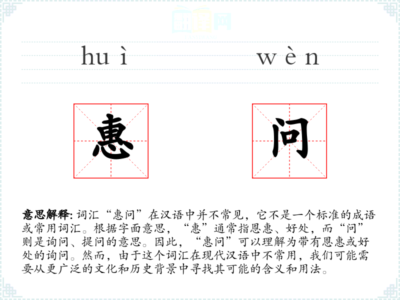 由于“惠问”不是一个常用词汇,它在不同语境下的使用可能非常有限。在文学作品中,作者可能会创造性地使用这个词汇来表达一种特殊的询问方式,即提问者希望通过提问给予对方某种精神上的支持或帮助。
