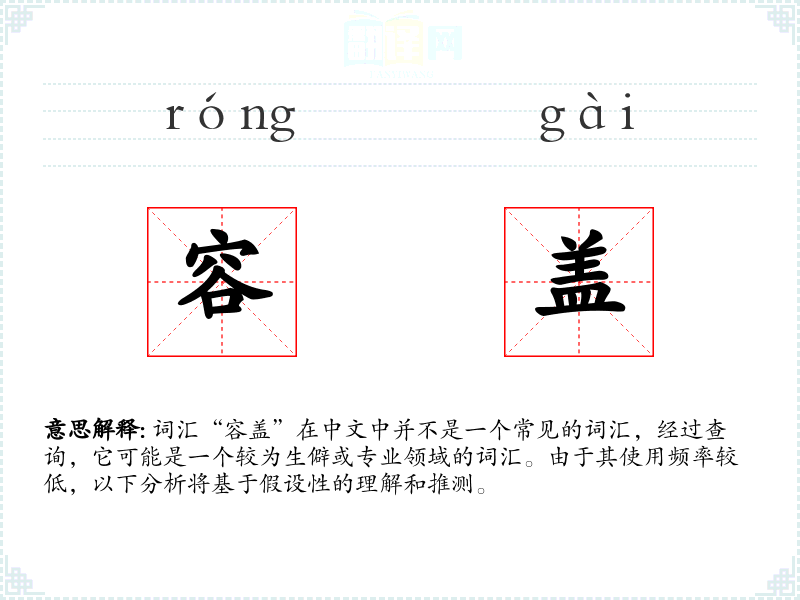 词汇“容盖”在中文中并不是一个常见的词汇,经过查询,它可能是一个较为生僻或专业领域的词汇。由于其使用频率较低,以下分析将基于假设性的理解和推测。