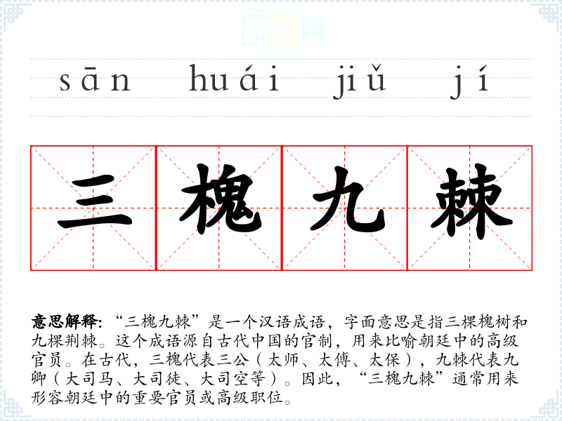 “三槐九棘”源自《周礼》,其中记载了古代的官制和礼仪。随着时间的推移,这个成语逐渐被用来泛指高级官员,而不仅仅是三公九卿。