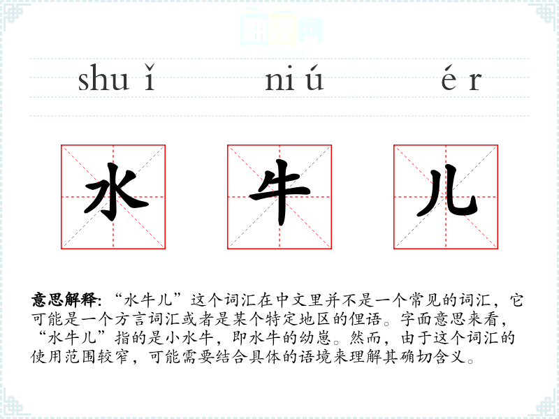 由于“水牛儿”不是一个标准汉语词汇,其词源和演变可能与特定地区的语言习惯有关。在某些方言中,“儿”字常用来表示小或者可爱的事物,因此“水牛儿”可能就是这种用法的一个例子。