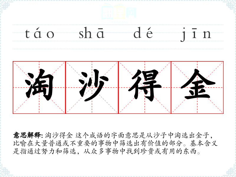 淘沙得金 这个成语的字面意思是从沙子中淘选出金子,比喻在大量普通或不重要的事物中筛选出有价值的部分。基本含义是指通过努力和筛选,从众多事物中找到珍贵或有用的东西。
