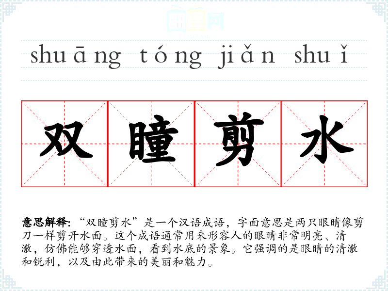 “双瞳剪水”这个成语的词源并不十分明确,但它显然是受到了古代文学中对眼睛美丽描写的启发。在古代文学作品中,眼睛常常被赋予特殊的象征意义,如清澈的眼睛象征纯洁和智慧。随着时间的推移,这个成语逐渐被用来形容眼睛的美丽和清澈。