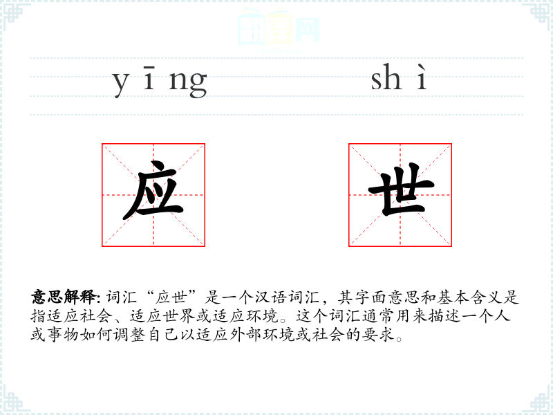 词汇“应世”是一个汉语词汇,其字面意思和基本含义是指适应社会、适应世界或适应环境。这个词汇通常用来描述一个人或事物如何调整自己以适应外部环境或社会的要求。