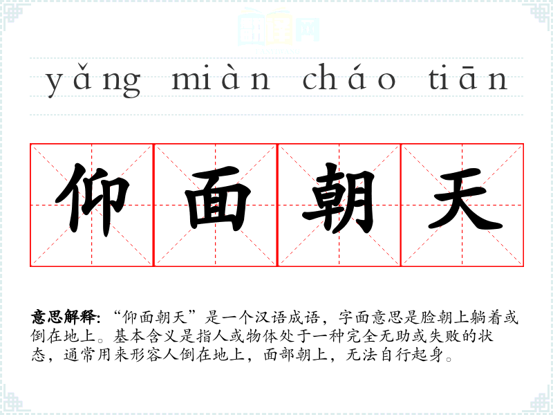 “仰面朝天”是一个汉语成语,字面意思是脸朝上躺着或倒在地上。基本含义是指人或物体处于一种完全无助或失败的状态,通常用来形容人倒在地上,面部朝上,无法自行起身。