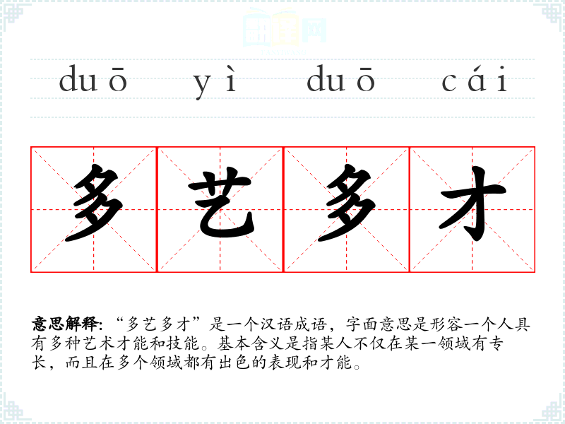 “多艺多才”是一个汉语成语,字面意思是形容一个人具有多种艺术才能和技能。基本含义是指某人不仅在某一领域有专长,而且在多个领域都有出色的表现和才能。