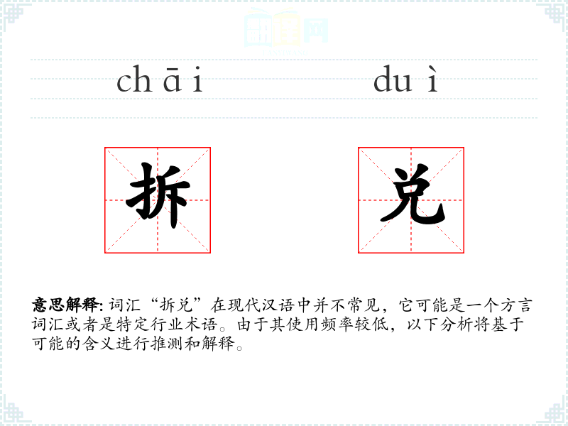 词汇“拆兑”在现代汉语中并不常见,它可能是一个方言词汇或者是特定行业术语。由于其使用频率较低,以下分析将基于可能的含义进行推测和解释。