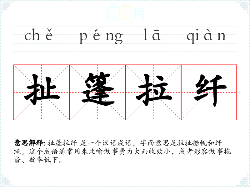 扯篷拉纤 是一个汉语成语,字面意思是拉扯船帆和纤绳。这个成语通常用来比喻做事费力大而收效小,或者形容做事拖沓、效率低下。