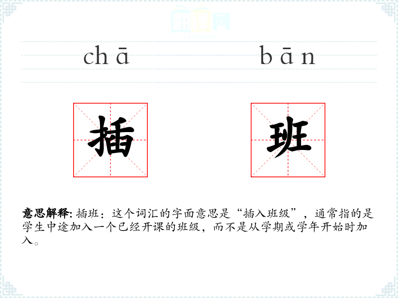 插班:这个词汇的字面意思是“插入班级”,通常指的是学生中途加入一个已经开课的班级,而不是从学期或学年开始时加入。