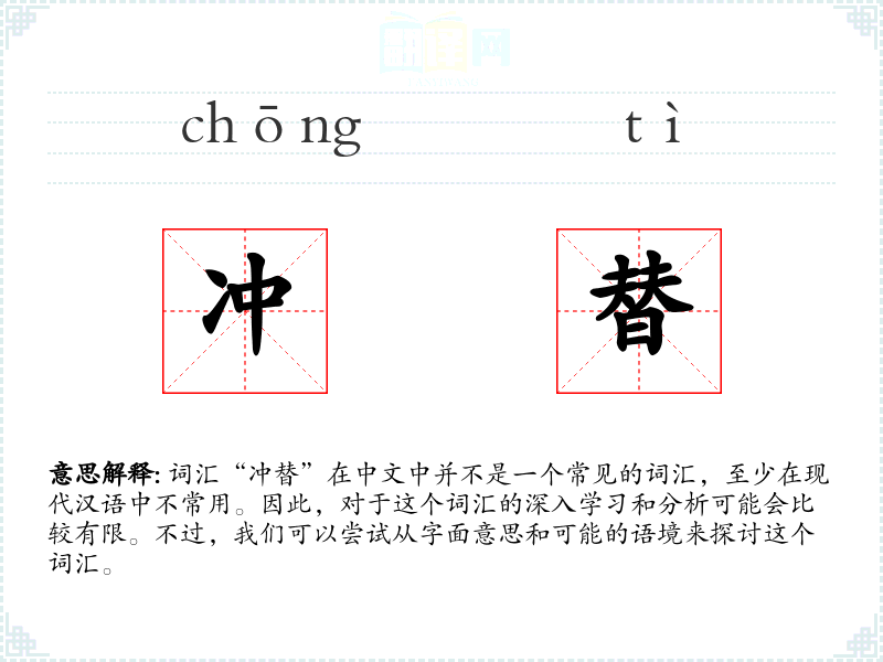 词汇“冲替”在中文中并不是一个常见的词汇,至少在现代汉语中不常用。因此,对于这个词汇的深入学习和分析可能会比较有限。不过,我们可以尝试从字面意思和可能的语境来探讨这个词汇。