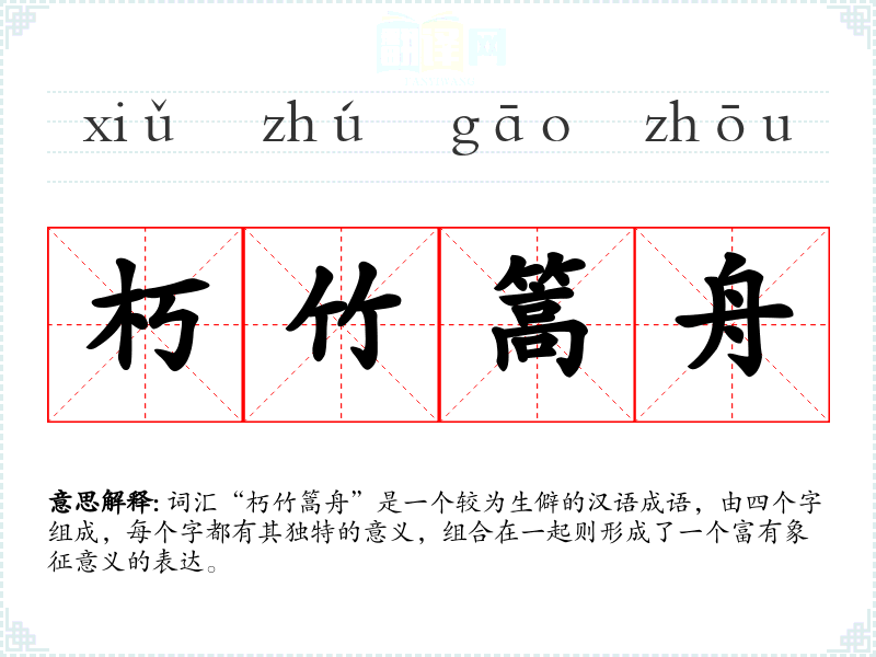 词汇“朽竹篙舟”是一个较为生僻的汉语成语,由四个字组成,每个字都有其独特的意义,组合在一起则形成了一个富有象征意义的表达。