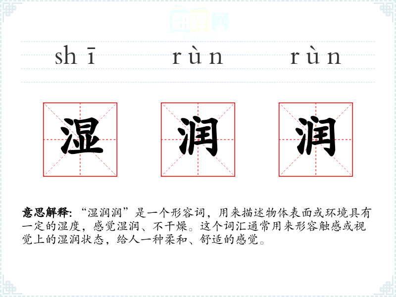 “湿润润”是一个形容词,用来描述物体表面或环境具有一定的湿度,感觉湿润、不干燥。这个词汇通常用来形容触感或视觉上的湿润状态,给人一种柔和、舒适的感觉。