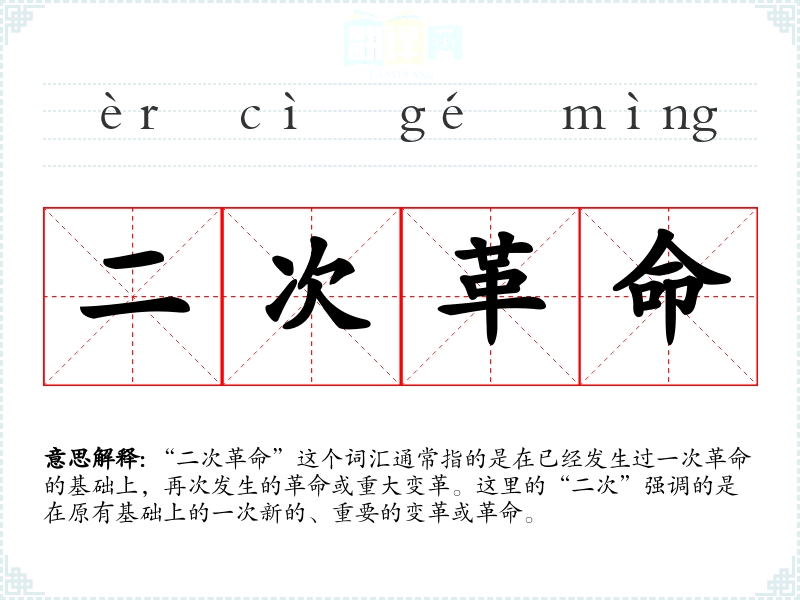 在不同语言或文化中,“二次革命”可能没有直接对应的词汇,但其概念可以通过不同的词汇组合来表达,如在法语中可能是“deuxième révolution”。