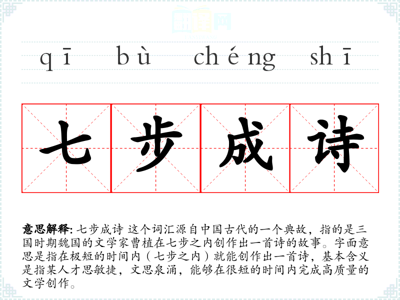 七步成诗 这个词汇源自**古代的一个典故,指的是三国时期魏国的文学家曹植在七步之内创作出一首诗的故事。字面意思是指在极短的时间内(七步之内)就能创作出一首诗,基本含义是指某人才思敏捷,文思泉涌,能够在很短的时间内完成高质量的文学创作。