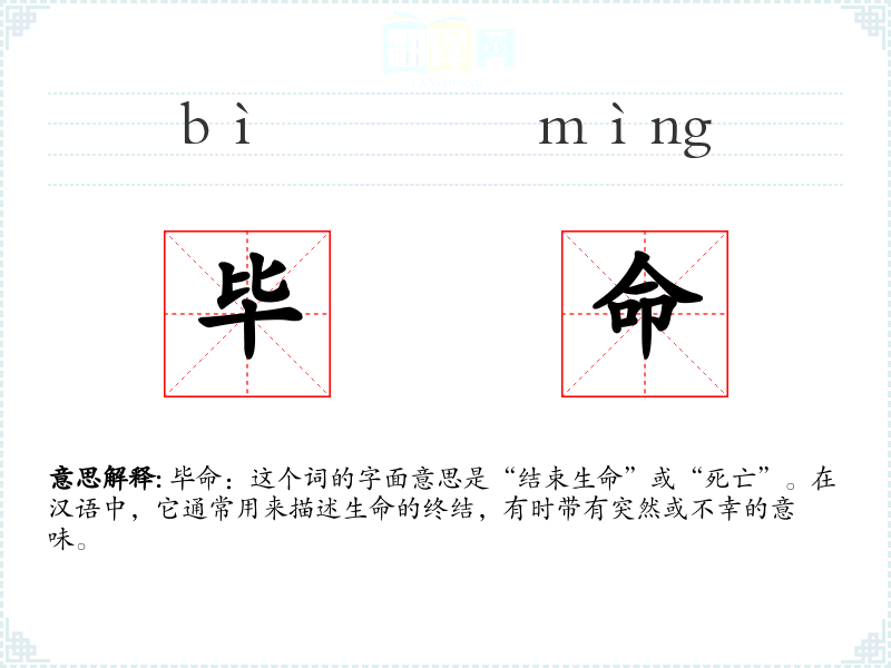毕命:这个词的字面意思是“结束生命”或“死亡”。在汉语中,它通常用来描述生命的终结,有时带有突然或不幸的意味。