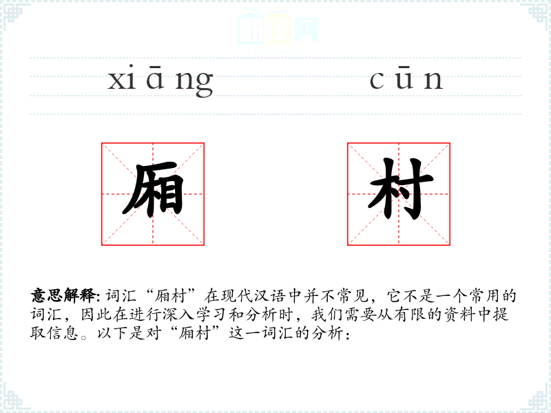 词汇“厢村”在现代汉语中并不常见,它不是一个常用的词汇,因此在进行深入学*和分析时,我们需要从有限的资料中提取信息。以下是对“厢村”这一词汇的分析: