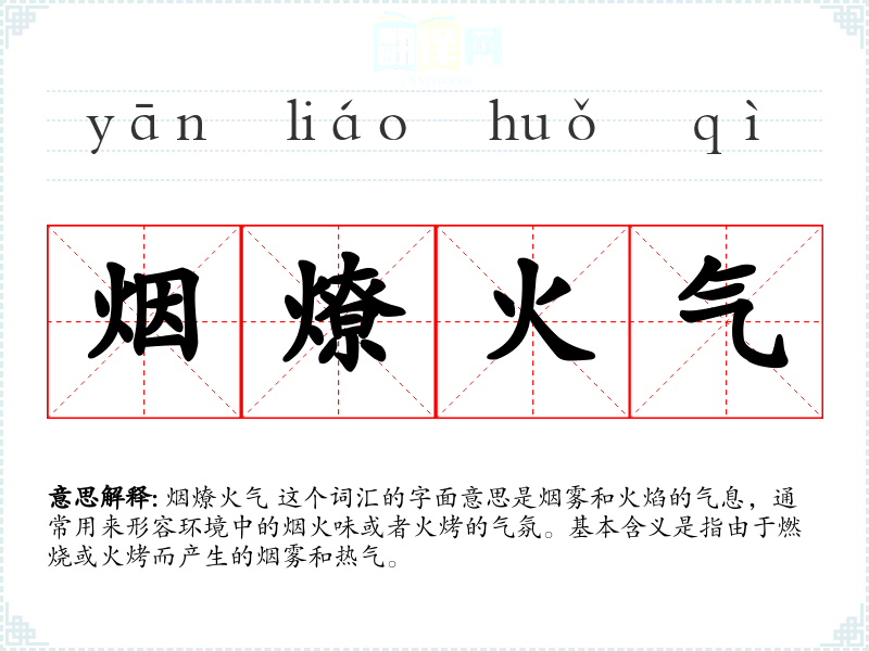 烟燎火气 这个词汇的字面意思是烟雾和火焰的气息,通常用来形容环境中的烟火味或者火烤的气氛。基本含义是指由于燃烧或火烤而产生的烟雾和热气。