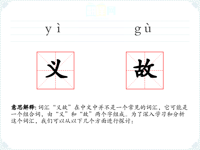 词汇“义故”在中文中并不是一个常见的词汇,它可能是一个组合词,由“义”和“故”两个字组成。为了深入学*和分析这个词汇,我们可以从以下几个方面进行探讨: