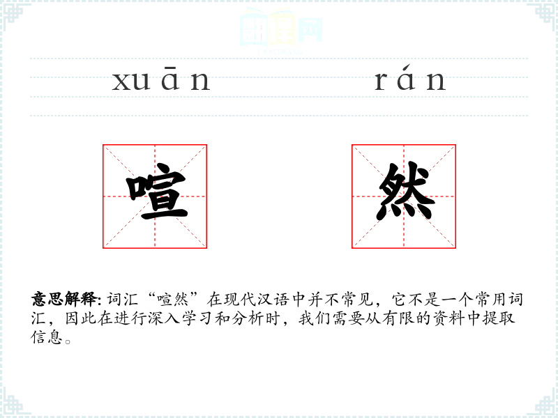 由于“喧然”不是一个常用词汇,关于其词源和历史演变的详细资料较少。从字面上看,“喧”字意为声音大,而“然”字在这里起到形容词后缀的作用,加强语气。