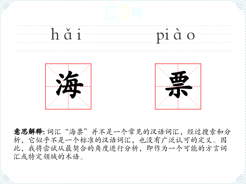 由于“海票”不是一个标准词汇,我们无法给出一个确切的字面意思和基本含义。它可能是某个地区方言中的词汇,或者是某个特定行业(如航海、渔业)的术语。