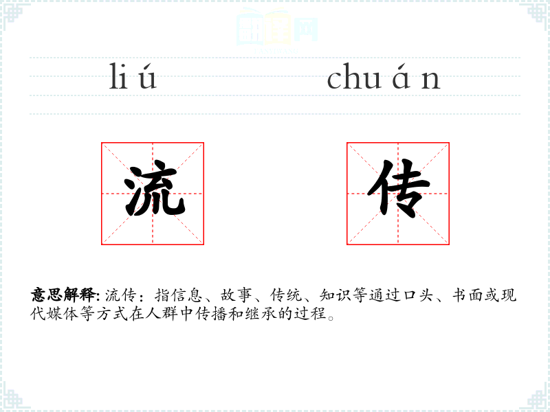 “流传”一词由“流”和“传”两个字组成。在古代汉语中,“流”有流动、传播的意思,“传”则指传递、传承。随着时间的推移,“流传”逐渐被用来描述信息、故事等的传播过程。