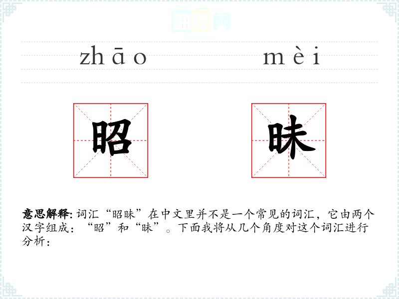 词汇“昭昧”在中文里并不是一个常见的词汇,它由两个汉字组成:“昭”和“昧”。下面我将从几个角度对这个词汇进行分析: