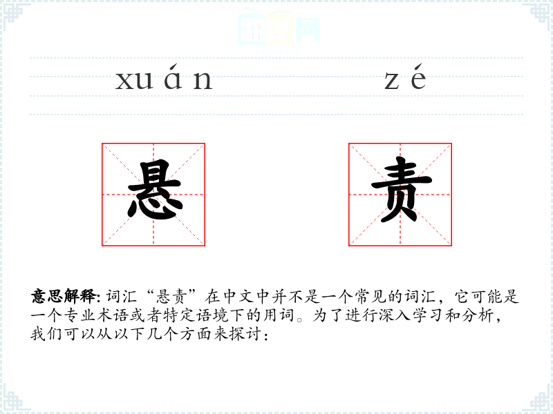 词汇“悬责”在中文中并不是一个常见的词汇,它可能是一个专业术语或者特定语境下的用词。为了进行深入学习和分析,我们可以从以下几个方面来探讨:
