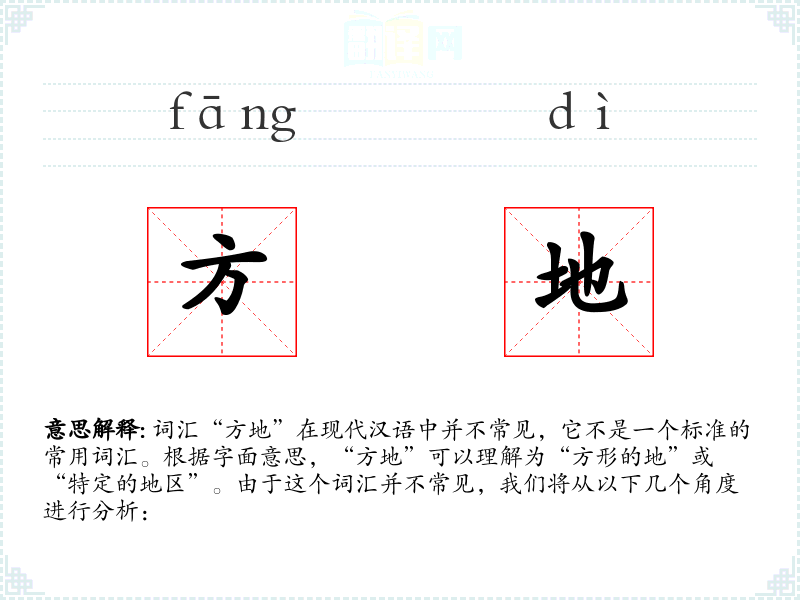 词汇“方地”在现代汉语中并不常见,它不是一个标准的常用词汇。根据字面意思,“方地”可以理解为“方形的地”或“特定的地区”。由于这个词汇并不常见,我们将从以下几个角度进行分析: