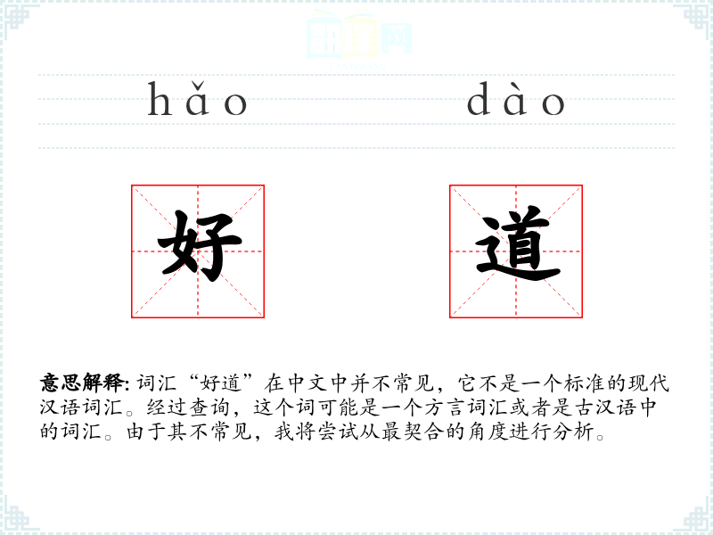 词汇“好道”在中文中并不常见,它不是一个标准的现代汉语词汇。经过查询,这个词可能是一个方言词汇或者是古汉语中的词汇。由于其不常见,我将尝试从最契合的角度进行分析。
