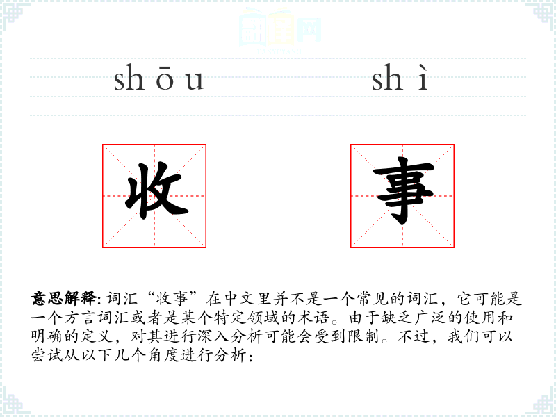 "收事"的意思解释、收事是什么意思由翻译网汉语词典查词提供。