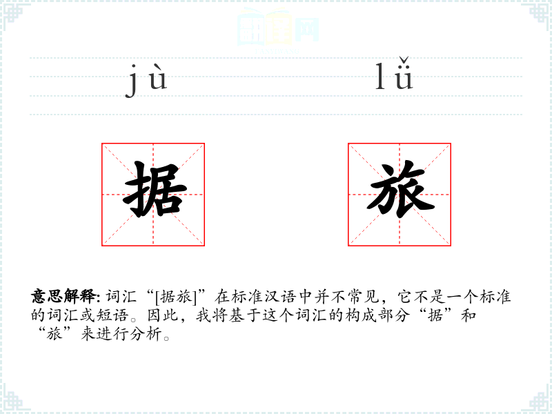 词汇“[据旅]”在标准汉语中并不常见,它不是一个标准的词汇或短语。因此,我将基于这个词汇的构成部分“据”和“旅”来进行分析。