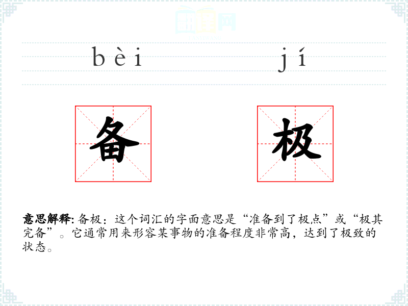 备极:这个词汇的字面意思是“准备到了极点”或“极其完备”。它通常用来形容某事物的准备程度非常高,达到了极致的状态。