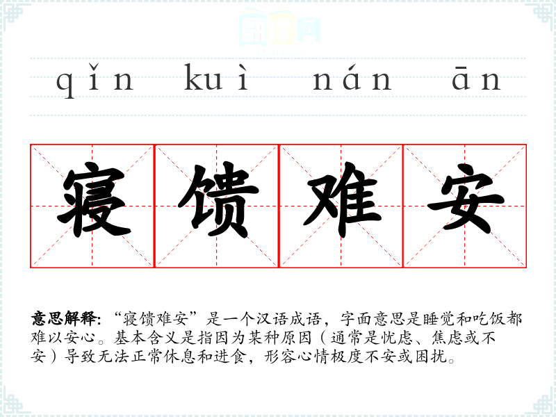 “寝馈难安”是一个汉语成语,字面意思是睡觉和吃饭都难以安心。基本含义是指因为某种原因(通常是忧虑、焦虑或不安)导致无法正常休息和进食,形容心情极度不安或困扰。