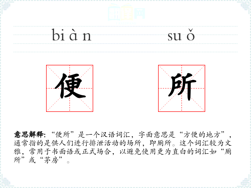 “便所”是一个汉语词汇,字面意思是“方便的地方”,通常指的是供人们进行排泄活动的场所,即厕所。这个词汇较为文雅,常用于书面语或正式场合,以避免使用更为直白的词汇如“厕所”或“茅房”。