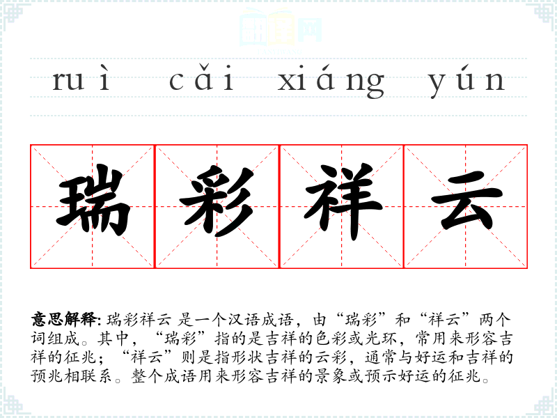 瑞彩祥云 是一个汉语成语,由“瑞彩”和“祥云”两个词组成。其中,“瑞彩”指的是吉祥的色彩或光环,常用来形容吉祥的征兆;“祥云”则是指形状吉祥的云彩,通常与好运和吉祥的预兆相联系。整个成语用来形容吉祥的景象或预示好运的征兆。