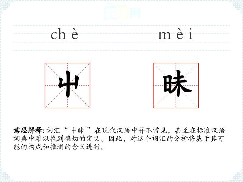 词汇“[屮昧]”在现代汉语中并不常见,甚至在标准汉语词典中难以找到确切的定义。因此,对这个词汇的分析将基于其可能的构成和推测的含义进行。