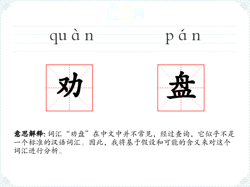 词汇“劝盘”在中文中并不常见,经过查询,它似乎不是一个标准的汉语词汇。因此,我将基于假设和可能的含义来对这个词汇进行分析。