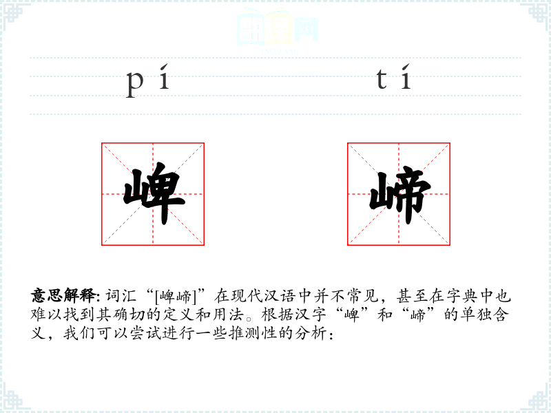词汇“[崥崹]”在现代汉语中并不常见,甚至在字典中也难以找到其确切的定义和用法。根据汉字“崥”和“崹”的单独含义,我们可以尝试进行一些推测性的分析: