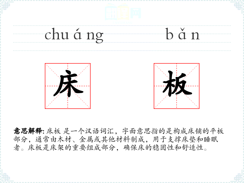 - 反义词:床垫(床板是支撑结构,床垫是软垫部分)