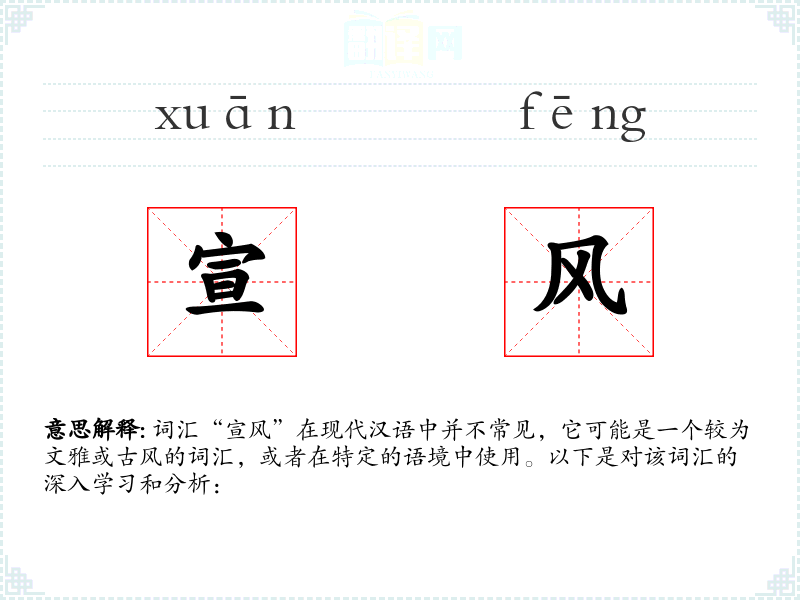 词汇“宣风”在现代汉语中并不常见,它可能是一个较为文雅或古风的词汇,或者在特定的语境中使用。以下是对该词汇的深入学*和分析: