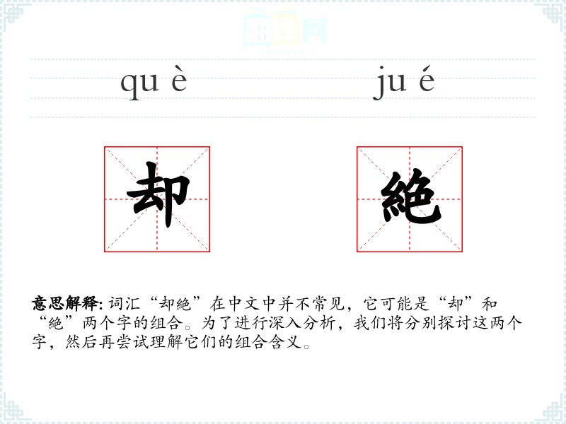 词汇“却絶”在中文中并不常见,它可能是“却”和“絶”两个字的组合。为了进行深入分析,我们将分别探讨这两个字,然后再尝试理解它们的组合含义。