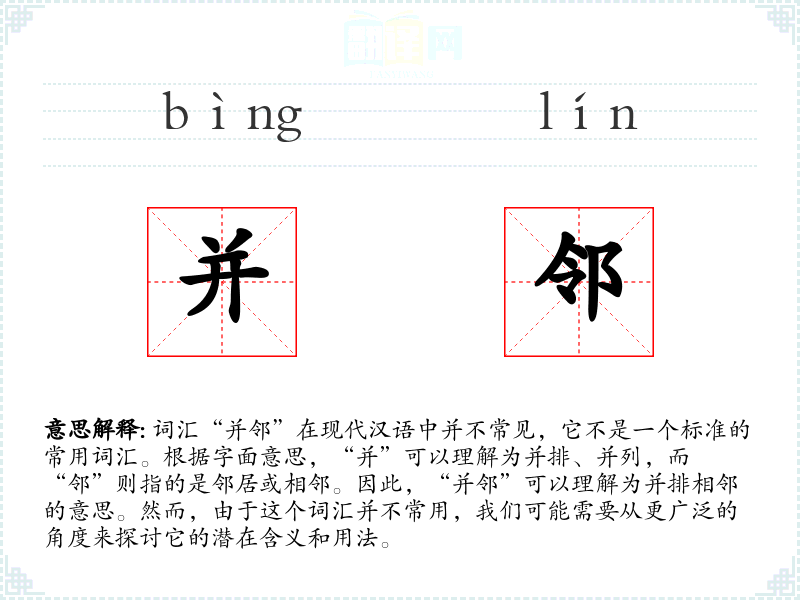 “并邻”的字面意思是指两个或多个物体、人或事物并排相邻。