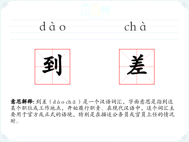 到差(dào chā)是一个汉语词汇,字面意思是指到达某个职位或工作地点,开始履行职责。在现代汉语中,这个词汇主要用于官方或正式的语境,特别是在描述公务员或官员上任的情况时。