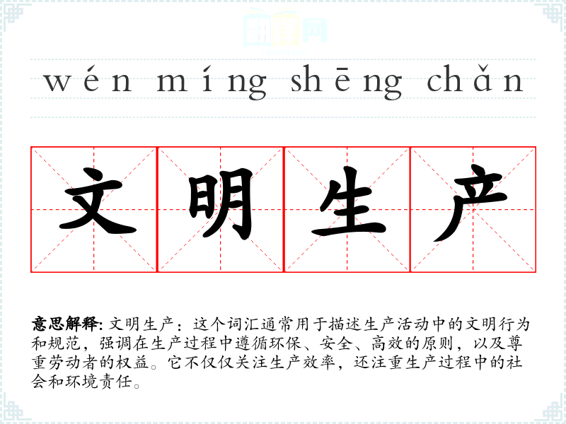 文明生产是一个综合性的概念,它要求企业在追求经济效益的同时,也要考虑到环境和社会的影响。通过对这个词汇的学习和分析,我们可以更好地理解如何在现代生产活动中实现可持续发展。