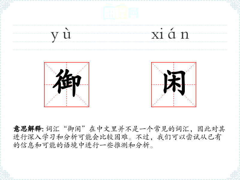 “御闲”字面意思可能是指“控制闲暇”或“利用闲暇”。其中,“御”字有控制、驾驭的意思,而“闲”则指闲暇、空闲时间。