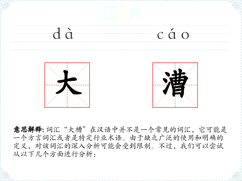 由于“大槽”不是一个标准汉语词汇,我们无法提供一个确切的字面意思和基本含义。它可能是指一个较大的槽或容器,或者是某个特定行业中的术语。