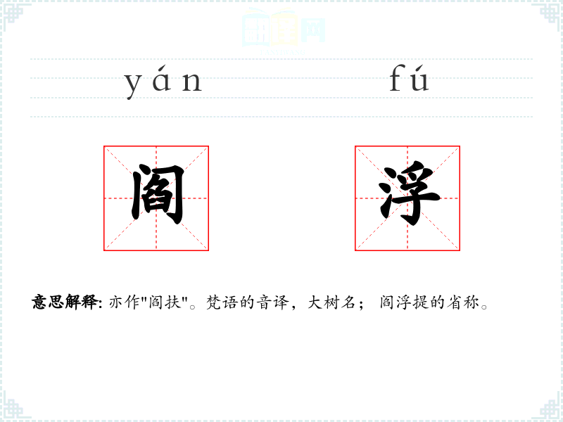亦作"阎扶"。梵语的音译,大树名; 阎浮提的省称。