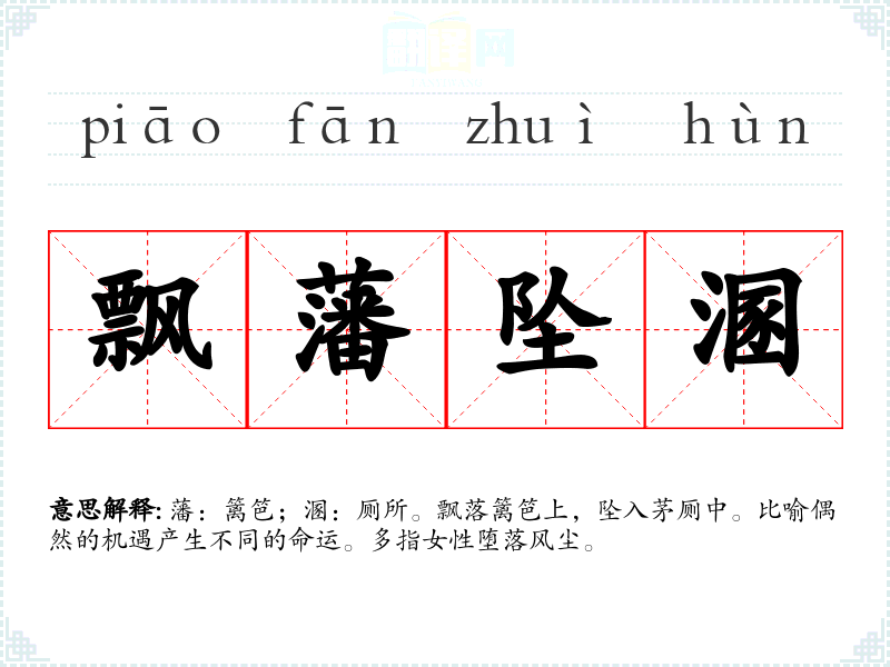 藩:篱笆;溷:厕所。飘落篱笆上,坠入茅厕中。比喻偶然的机遇产生不同的命运。多指女性堕落风尘。