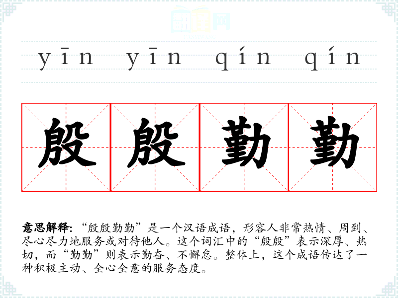 “殷殷勤勤”是一个汉语成语,形容人非常热情、周到、尽心尽力地服务或对待他人。这个词汇中的“殷殷”表示深厚、热切,而“勤勤”则表示勤奋、不懈怠。整体上,这个成语传达了一种积极主动、全心全意的服务态度。