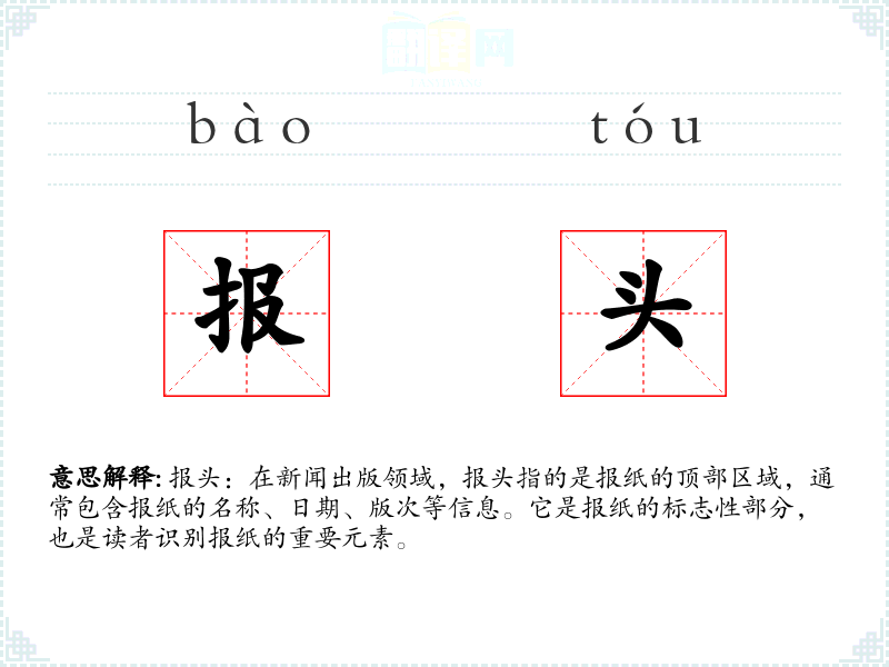 报头:在新闻出版领域,报头指的是报纸的顶部区域,通常包含报纸的名称、日期、版次等信息。它是报纸的标志性部分,也是读者识别报纸的重要元素。